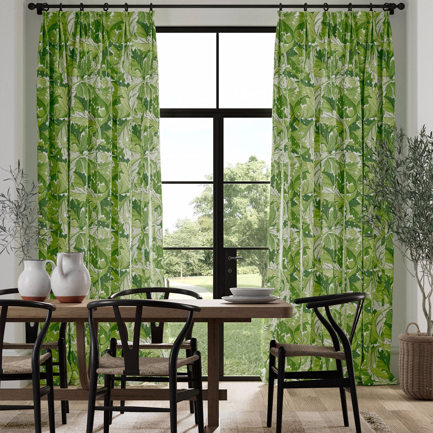 Denna mycket älskade design från 1875 markerade början på en period då Morris skapade storskaliga mönster för tapeter. Tryckt här på en bomull/linneblandning skapar rullande lager av akantusbladverk en dramatisk tredimensionell effekt.