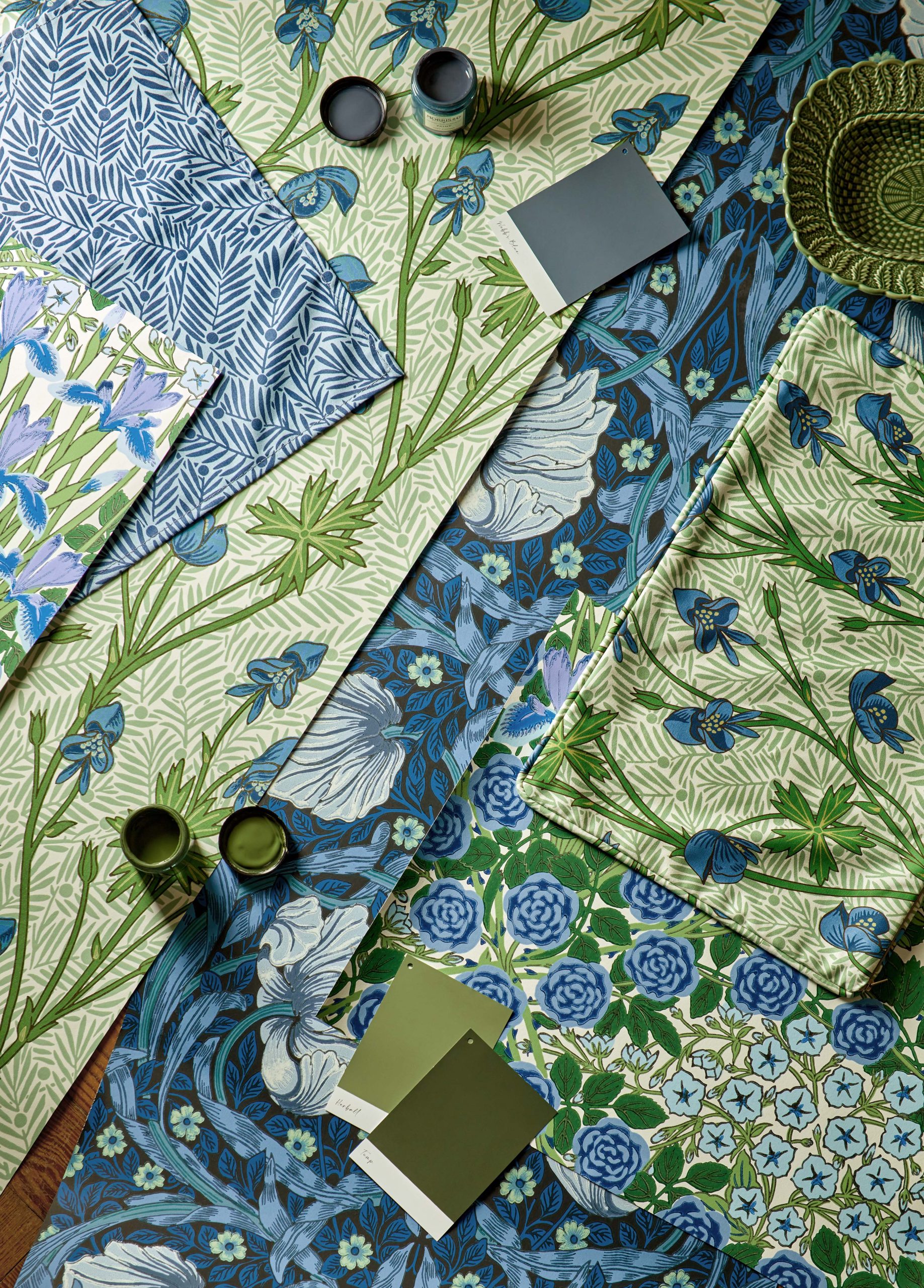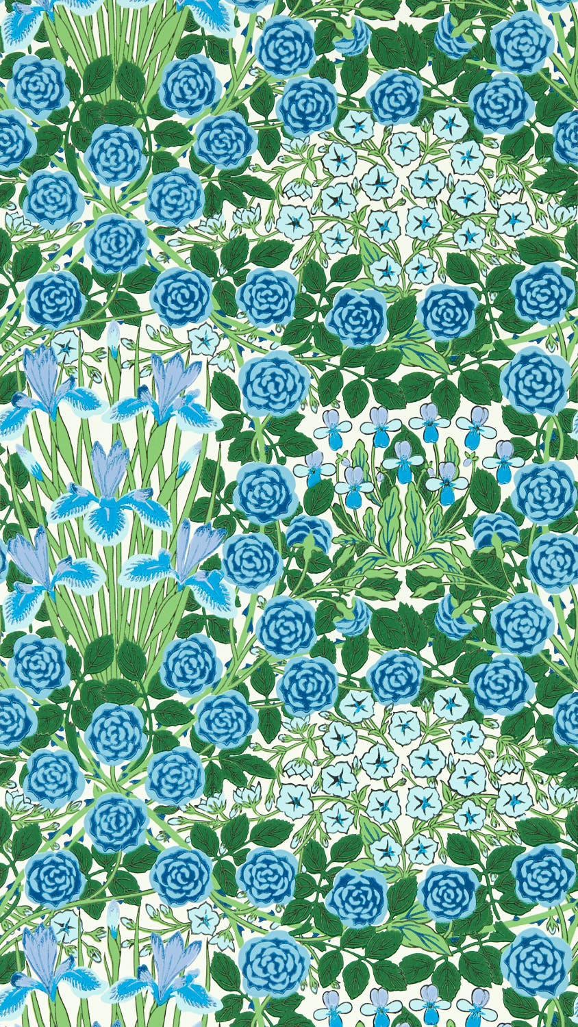 Campanulas härligt platta design, en tätt befolkad ram av vibrerande blommor, ges ett ytterligare lager av intensitet med de kraftfulla färgberättelserna. Alan Francis Vigers skapade Campanula 1900 och lät trycka den hos Jeffrey & Co., en tapettryckare som allmänt anses respektera hantverkstekniken. Vi har surflextryckt Campanula för att erbjuda en kontrast i djup mellan den platta ytan och designens tredimensionella egenskaper, och för att hylla de trätryckblock som var vanliga på William Morriss tid.